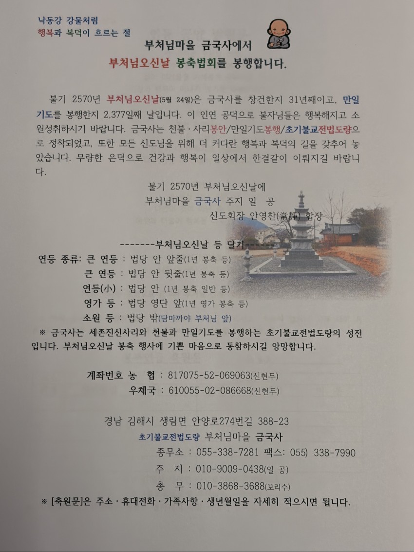 2026년 부처님오신날 안내문 페이지 정보 작성자 최고관리자 댓글 0건 조회 1회 작성일 26-04-21 20:50 본문 위 내용은 2026년 부처님오신날 안내문입니다. 목록 다음글김해 금국사 일공스님-초기불교의 이해 방송 안내 23.10.30 댓글목록 댓글목록 등록된 댓글이 없습니다.